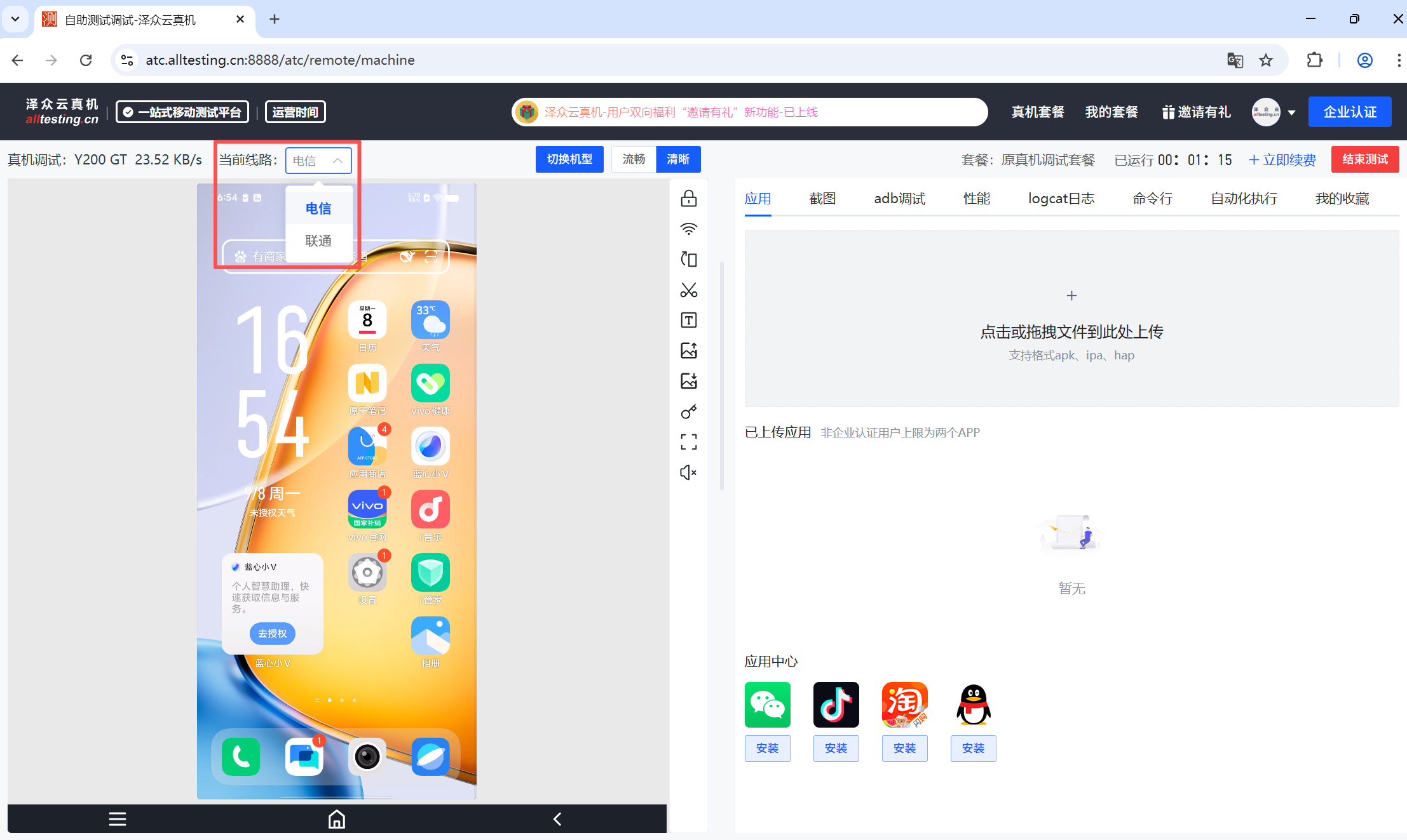 如果上面的情況都排除了,那就是網(wǎng)絡(luò)問(wèn)題,也是文章要說(shuō)的重點(diǎn)來(lái)了,遠(yuǎn)程真機(jī)調(diào)試時(shí),切換網(wǎng)絡(luò)線路試一試,電信(默認(rèn)線路)和聯(lián)通,根據(jù)自己操作流暢度選擇線路。