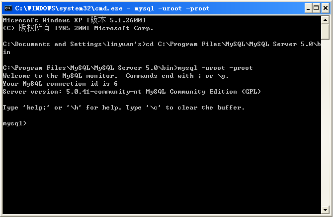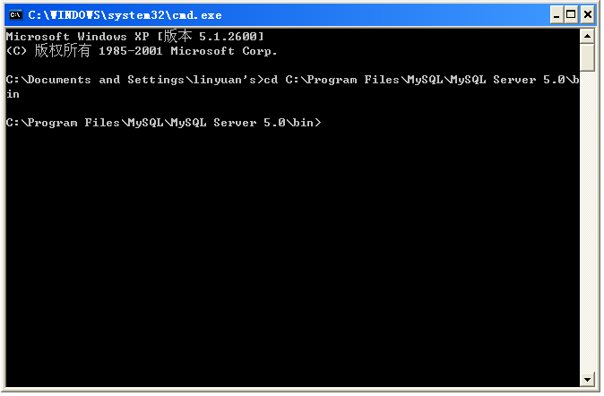 b、進(jìn)入Mysql的bin目錄,在cmd中輸入cd C:Program FilesMysqlMysql Server 5.0in(C:Program FilesMysqlMysql Server 5.0in只是一個(gè)舉例,用戶需要根據(jù)自己的實(shí)際安裝目錄輸入)