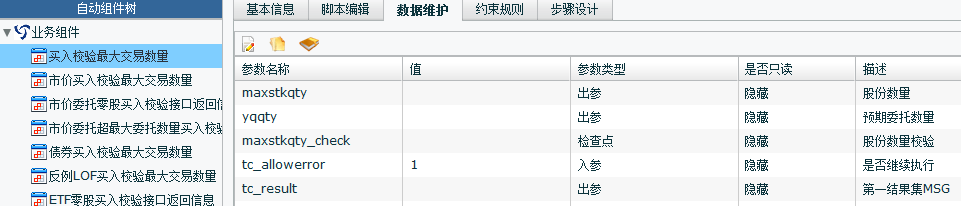 a、接口的制作需要有校驗點欄位;這里需要強調(diào)一下,410411是接口文檔中的接口,我們是將其制作成Excel按照特定格式導入到TC,這個組件只有出參入?yún)]有檢查點,有檢查點的組件是單獨用作校驗,“買入校驗交易數(shù)量”是測試人員根據(jù)校驗的需要制作的組件,如下,這個組件初在設計Excel時,只有3個欄位:maxstkqty、yqqty和maxstkqty_check,其中2個是出參1個是檢查點;其實maxstkqtyh和yqqty是入?yún)⒁部梢缘?,但我們一般做校驗組件習慣性將非校驗點的都設置為出參,其實除了校驗點,其他字段是入?yún)⑦€是出參并不重要,他們存在的意義只是從前面的組件值傳遞到這些字段;校驗點不一樣了,必須是C(檢查點):
