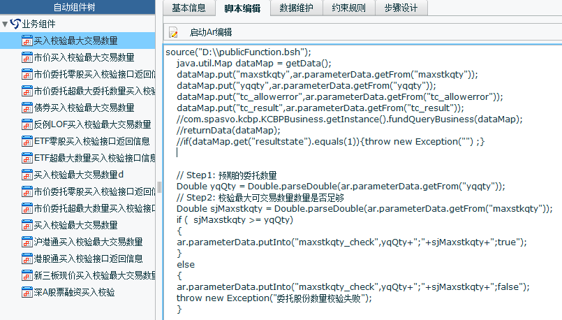 //第三步,判斷410410接口返回的交易數(shù)量是否大于等于用例中手工填寫的交易數(shù)量,如果大于等于則說明買股票的數(shù)量在可允許范圍內(nèi),換句話說是校驗點應該是正確的,ar.parameterData.putInto后面的括號有2個參數(shù),一個是校驗點字段名稱maxstkqty_check,后面一個是字符串拼接起來,意思是委托數(shù)量+可委托數(shù)量+true;那么相反,如果小于yqQty,則將yqQty+";"+sjMaxstkqty+";false"這個拼接的字符串putInto到maxstkqty_check這個校驗點字段;這里肯定很多讀者會有疑問,腳本這樣寫的目的是什么?用例執(zhí)行結(jié)束后怎么看校驗點執(zhí)行結(jié)果?校驗點的校驗結(jié)果對組件的執(zhí)行結(jié)果甚至是用例的執(zhí)行結(jié)果有何影響?下面第三步驟d會進行講述