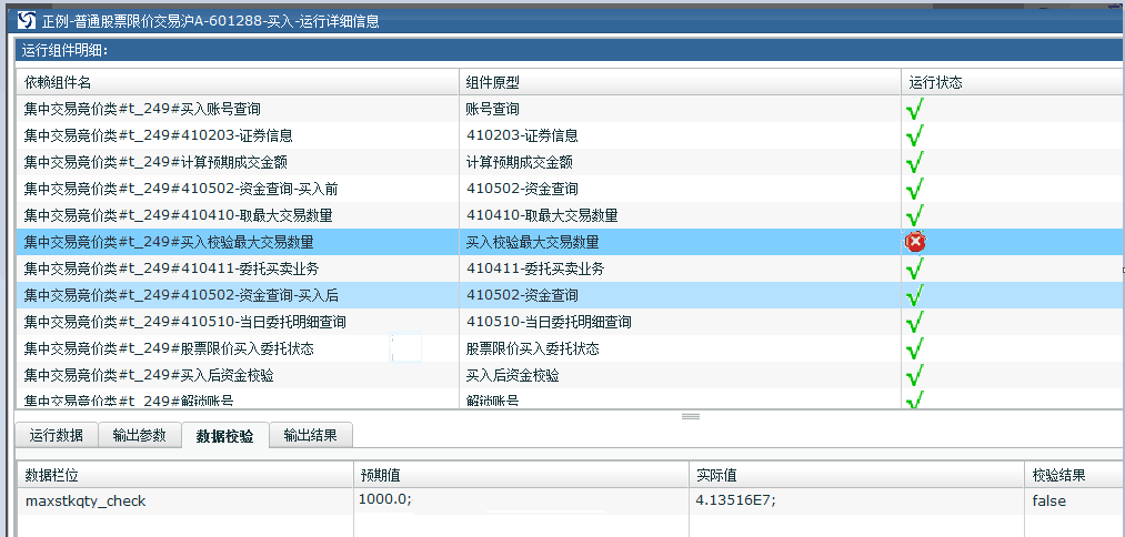 d、上面腳本中,如果走第一個分支,腳本沒有異常拋出,起碼可以說明該組件執(zhí)行正確,至于整個用例是否執(zhí)行正確這個文檔不再做過多描述(用例執(zhí)行正確必須保證該用例執(zhí)行后所有的組件都執(zhí)行正確,是該用例場景下所有組件執(zhí)行結(jié)果“與”的集合,如果該場景下有1個或1個以上組件運行失敗,則用例執(zhí)行結(jié)果是失?。?,該校驗組件無論執(zhí)行成功還是失敗都可以在測試輪次下自動測試日志中查看某一次運行的記錄,如下,從中找到對應的用例查看校驗點結(jié)果,雙擊“買入校驗交易數(shù)量”這個組件,可以在數(shù)據(jù)校驗中顯示:預期值、實際值、校驗結(jié)果,這些顯示的數(shù)據(jù)是通過上面編寫的腳本實現(xiàn)的;相反,如果校驗失敗,上面的腳本會走第二個分支,同時還會有Exception拋出,用例在執(zhí)行時如果腳本有異常語句運行了組件會失敗,也是下圖中會看到組件后面不是打鉤而是一個紅叉,同樣雙擊該組件可以看到“數(shù)據(jù)校驗”中顯示的預期值、實際值、校驗結(jié)果,可以通過看到顯示的預期值和實際值判斷為什么校驗失敗了: