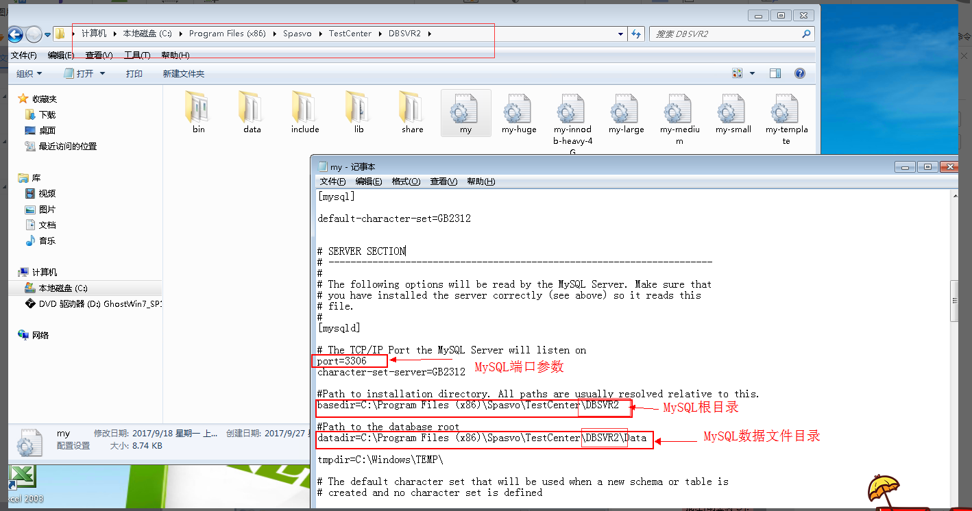 b) 停止spasvoDBServer服務(wù),先刪除原安裝包中的DBSVR文件夾,再將遷移的DBSVR 文件夾拷貝進(jìn)來,可修改my.ini配置文件,如下圖所示。其中MySQL端口號如果沖突,則修改為其他端口號,如果不沖突可以使用默認(rèn)的3306端口。basedir和datadir參數(shù)根據(jù)實際情況配置。