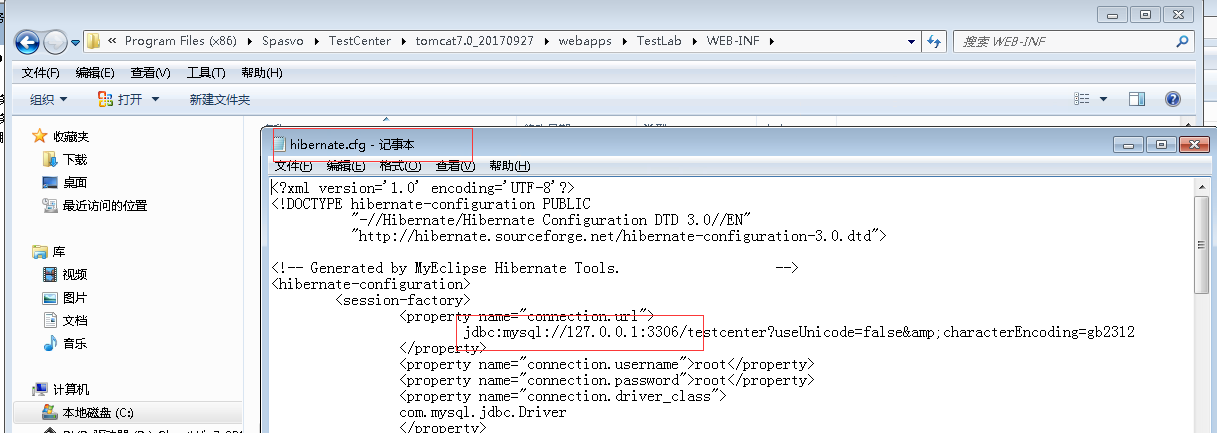 d) 查看TestCenter omcat7.0webappsTestLabWEB-INF文件夾中的hibernate.cfg.xml文件,確保圖中的ip和port配置正確,IP為TC數(shù)據(jù)庫所在服務(wù)器的IP地址,port為MySQL數(shù)據(jù)庫my.ini文件中配置的端口號。