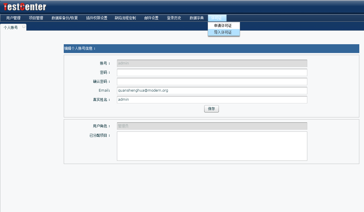 先點擊啟動TestCenter圖標(biāo),打開Tomcat服務(wù)器。然后在服務(wù)器上訪問http://localhost:8080/TestLab/Admin.html登錄管理員賬號(admin 111111),點擊許可證,選擇申請許可證,彈出申請許可證對話框,選擇需要申請的類型,使用的時長,以及同時在線人數(shù),點擊確定按鈕,即可導(dǎo)出license。若系統(tǒng)已過期不能登陸后臺,可以直接訪問