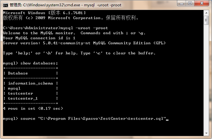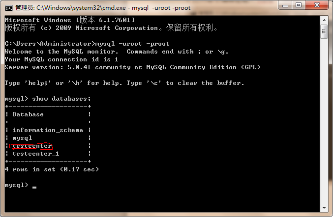2 輸入show databases;按回車,如圖:如果沒有紅圈里的項(xiàng),則表明基庫未導(dǎo)入成功。