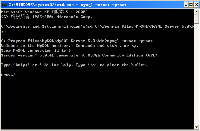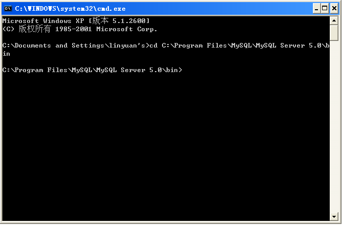b)進(jìn)入Mysql的bin目錄,在cmd中輸入cd C:Program FilesMySQLMySQL Server 5.0in(C:Program FilesMySQLMySQL Server 5.0in只是一個(gè)舉例,用戶需要根據(jù)自己的實(shí)際安裝目錄輸入)