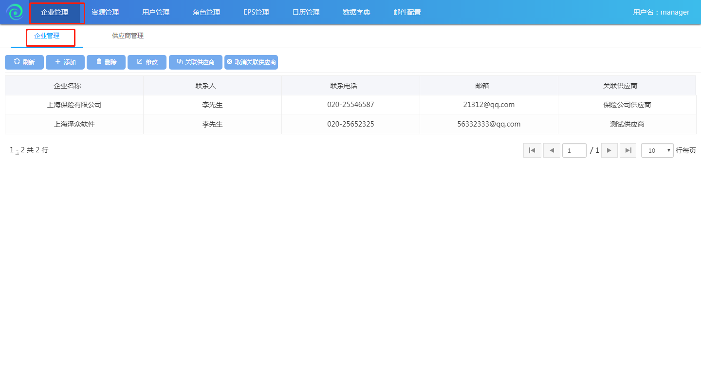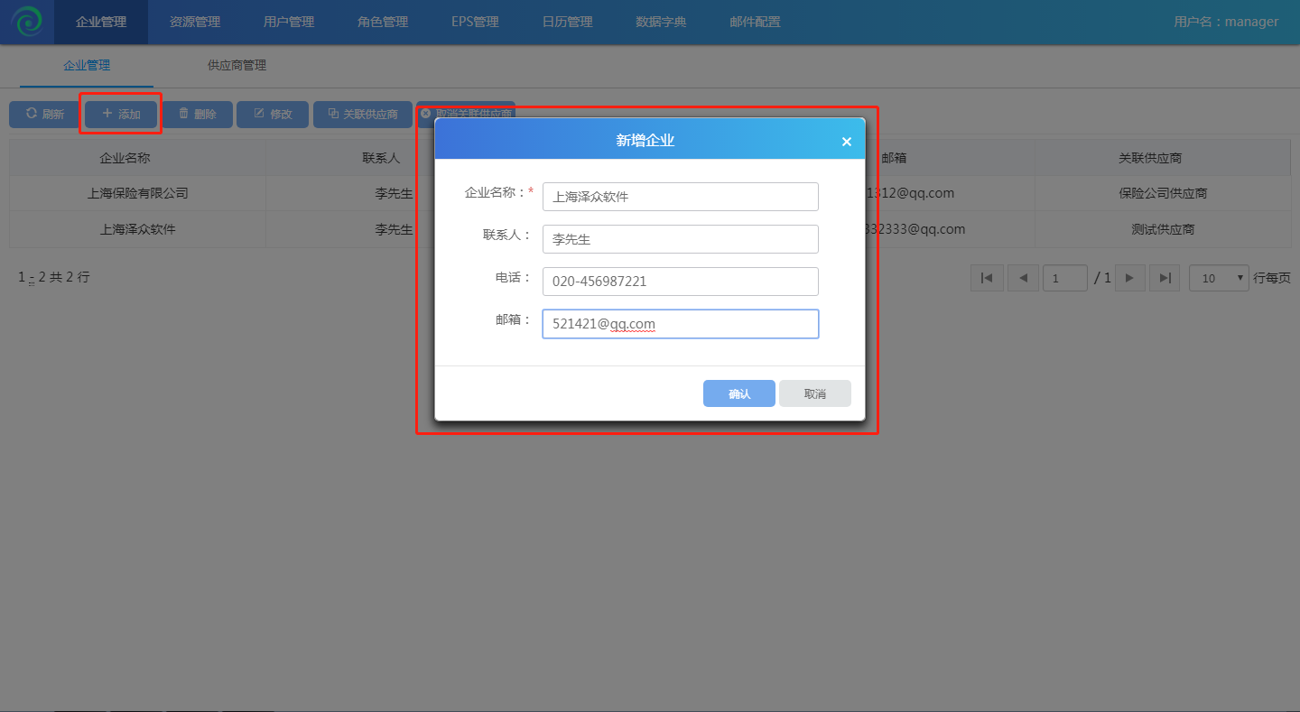 點(diǎn)擊【添加】按鈕,彈出添加企業(yè)對話框,依次輸入企業(yè)名稱、聯(lián)系人、電話和郵箱,點(diǎn)擊【確定】按鈕,添加成功。