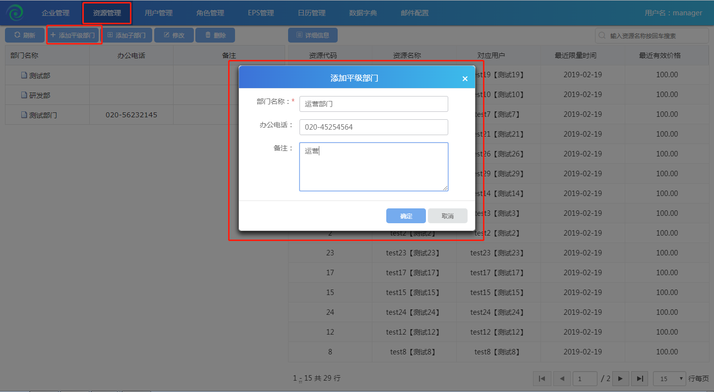 點(diǎn)擊【添加平級部門】按鈕或選中一個部門節(jié)點(diǎn),點(diǎn)擊【添加子部門】按鈕,可以彈出部門對話框,輸入部門名稱、備注和辦公電話,點(diǎn)擊【確定】按鈕,添加成功。