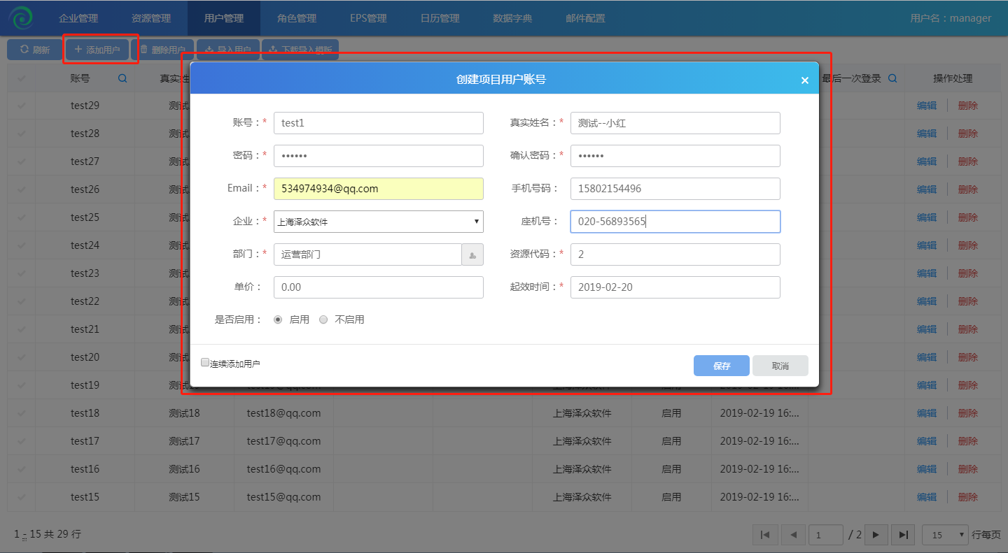點(diǎn)擊【添加用戶】按鈕,彈出創(chuàng)建項(xiàng)目用戶賬號對話框,輸入賬號、密碼、真實(shí)姓名、Email、手機(jī)號、座機(jī)號、資源代碼、單價和起效時間,選擇企業(yè)和部門,點(diǎn)擊【保存】按鈕,添加完成。支持連續(xù)添加用戶。