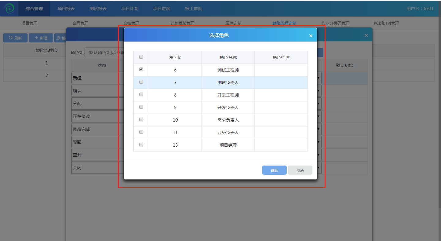3.點(diǎn)擊缺陷節(jié)點(diǎn)的角色列,彈出角色選擇對(duì)話框,角色欄可選角色是角色組下的角色,勾選處理,勾選可以使缺陷進(jìn)入第2步中選中的狀態(tài)的角色。