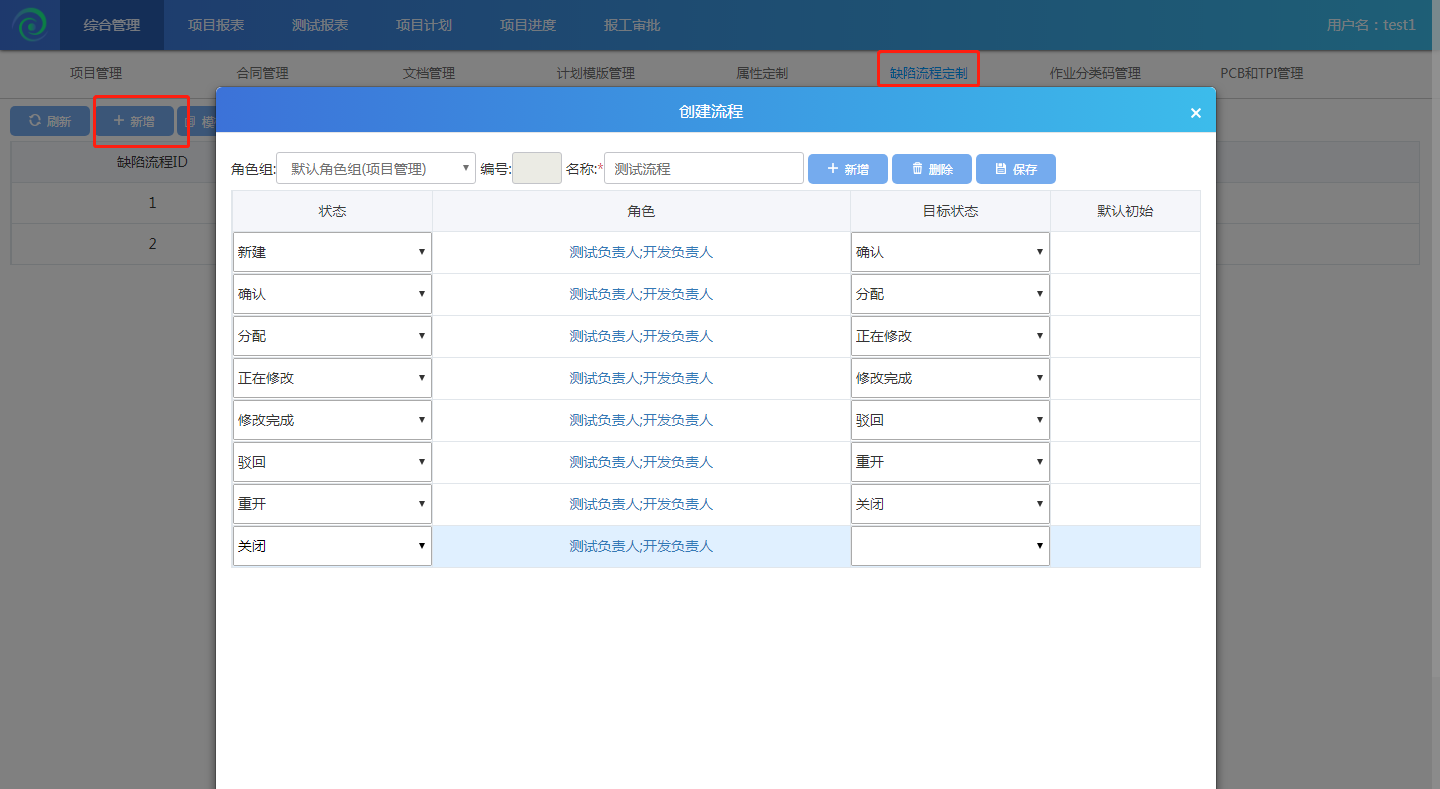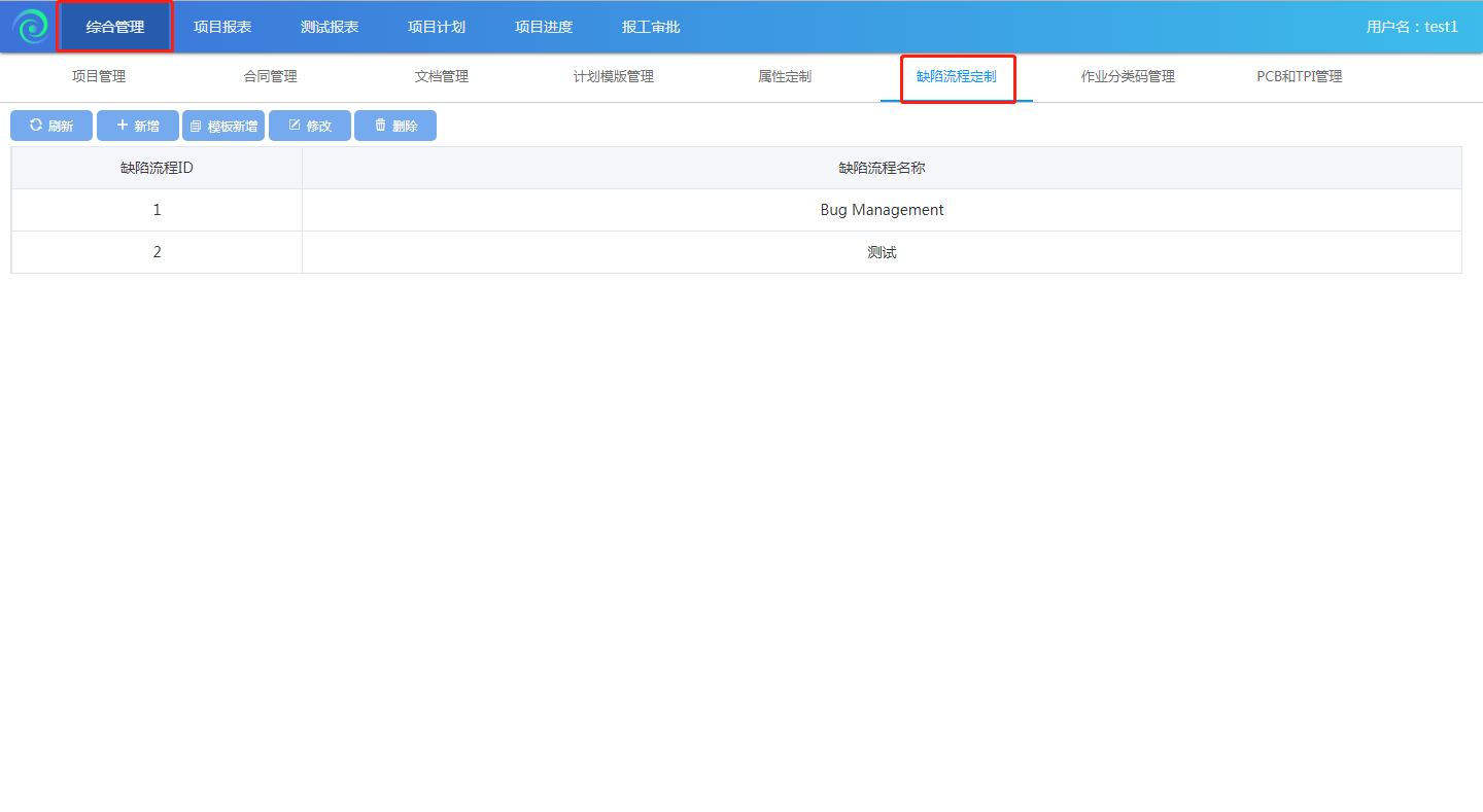 點(diǎn)擊【綜合管理】-【缺陷流程定制】進(jìn)入到缺陷流程定制頁(yè)面