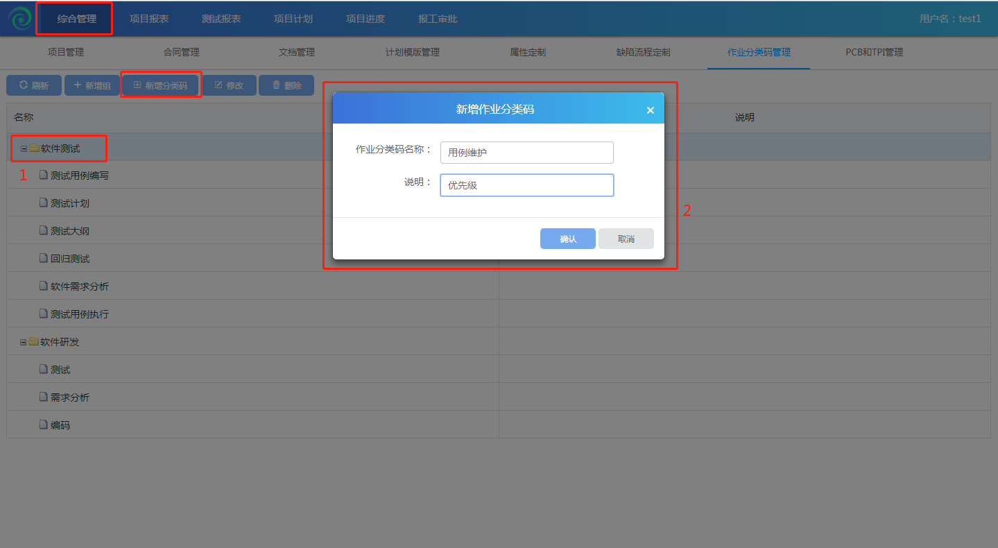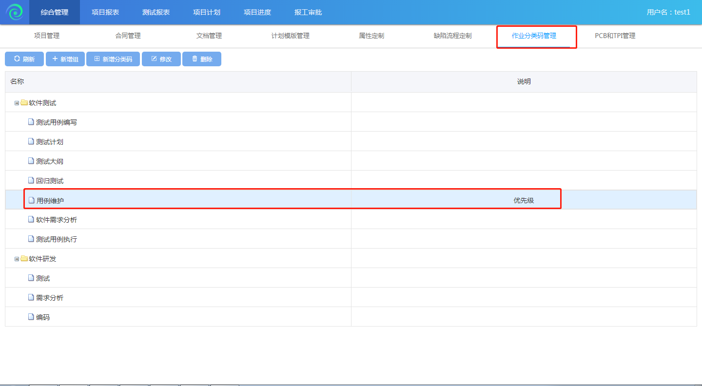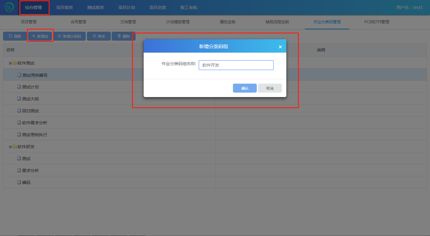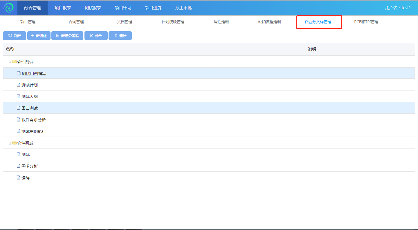頁(yè)面顯示默認(rèn)的項(xiàng)目分類(lèi)碼:軟件測(cè)試和軟件研發(fā)。項(xiàng)目分類(lèi)碼下顯示默認(rèn)的作業(yè)分類(lèi)碼。