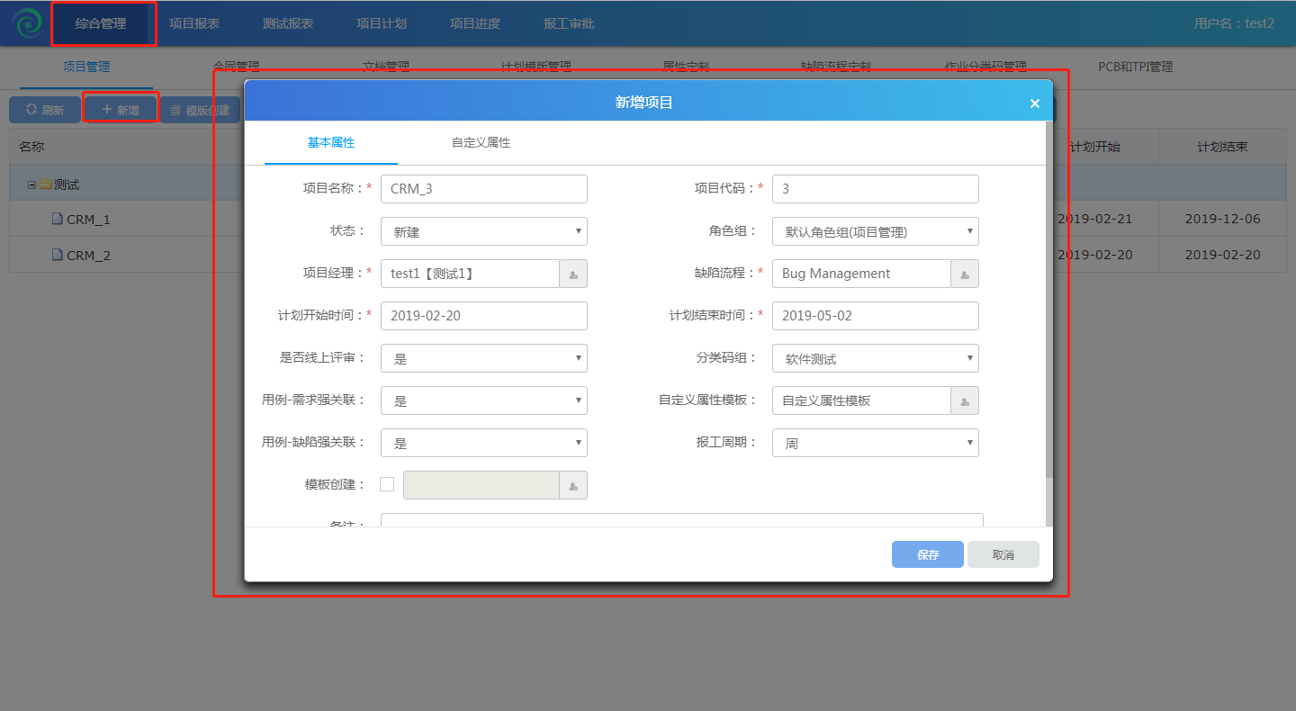 選中EPS節(jié)點(diǎn):測(cè)試,點(diǎn)擊【新增項(xiàng)目】按鈕,彈出新增項(xiàng)目頁(yè)面,輸入項(xiàng)目名稱、項(xiàng)目代碼,選擇狀態(tài)-新建(根據(jù)項(xiàng)目目前所處狀態(tài)選擇項(xiàng)目狀態(tài),項(xiàng)目狀態(tài)包括:新建、立項(xiàng)、實(shí)施、完成、結(jié)項(xiàng)),選擇角色組-CRM角色組(后臺(tái)管理創(chuàng)建),選擇項(xiàng)目經(jīng)理、缺陷流程、計(jì)劃開始與結(jié)束時(shí)間、分類碼組,是否線上評(píng)審-是、強(qiáng)關(guān)聯(lián)-是,點(diǎn)擊【確定】按鈕,添加成功。