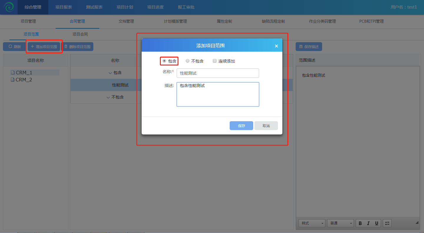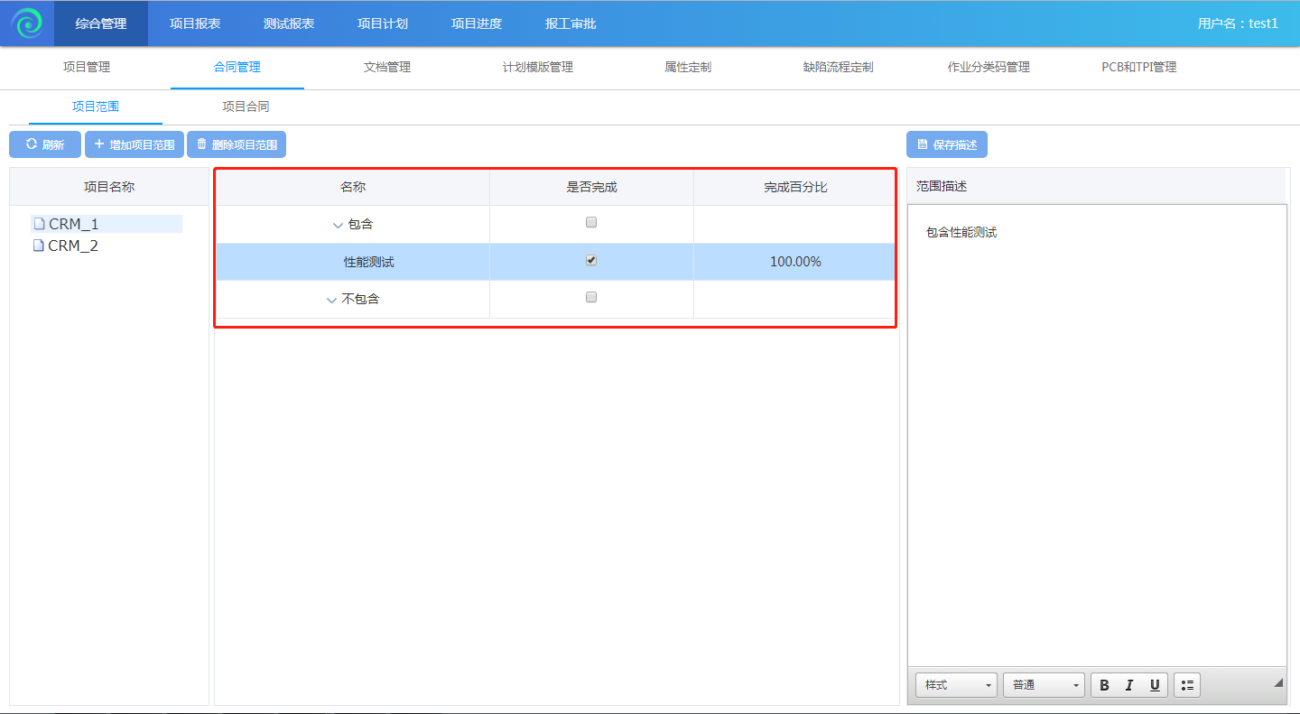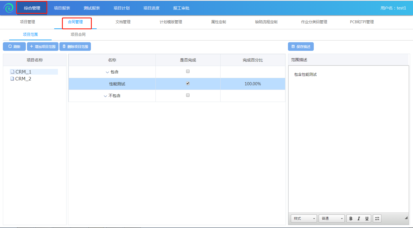 項(xiàng)目范圍定義了項(xiàng)目應(yīng)該要做什么事,不該做什么事。所以在創(chuàng)建完項(xiàng)目之后,登錄項(xiàng)目經(jīng)理-test1用戶,之后再進(jìn)入綜合管理-合同管理-項(xiàng)目范圍去創(chuàng)建項(xiàng)目范圍。