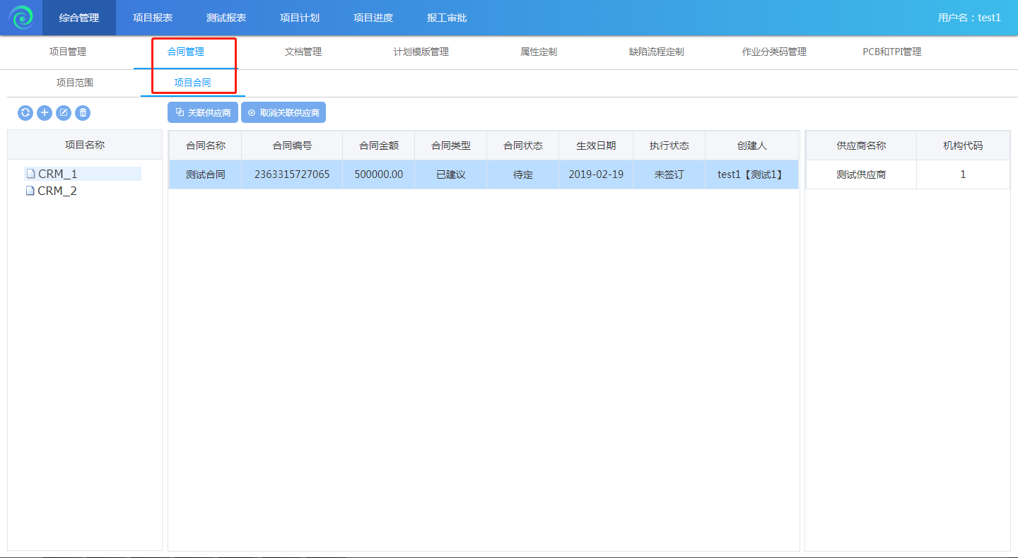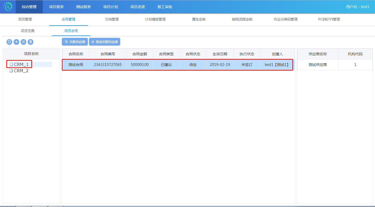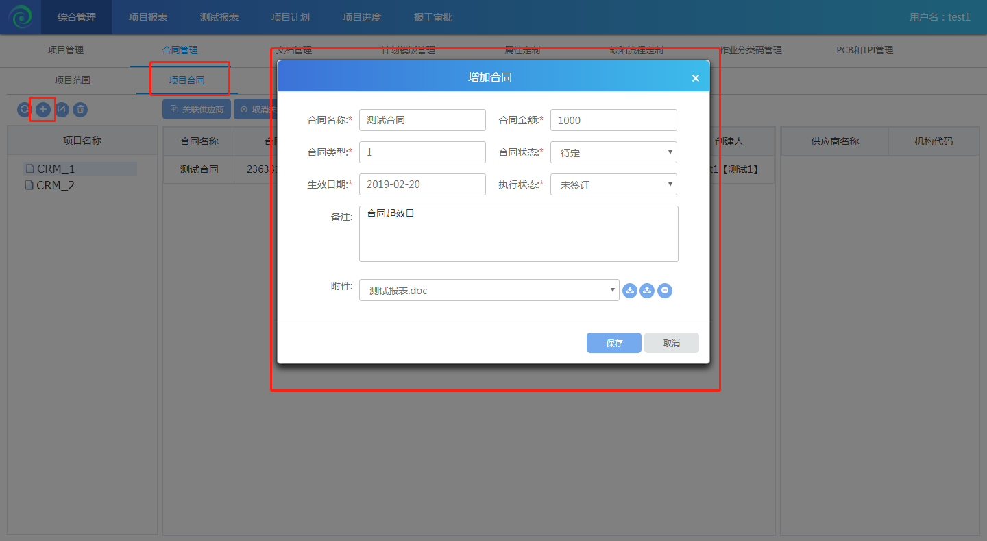 所以在創(chuàng)建項(xiàng)目范圍之后,由項(xiàng)目經(jīng)理test1創(chuàng)建項(xiàng)目合同。