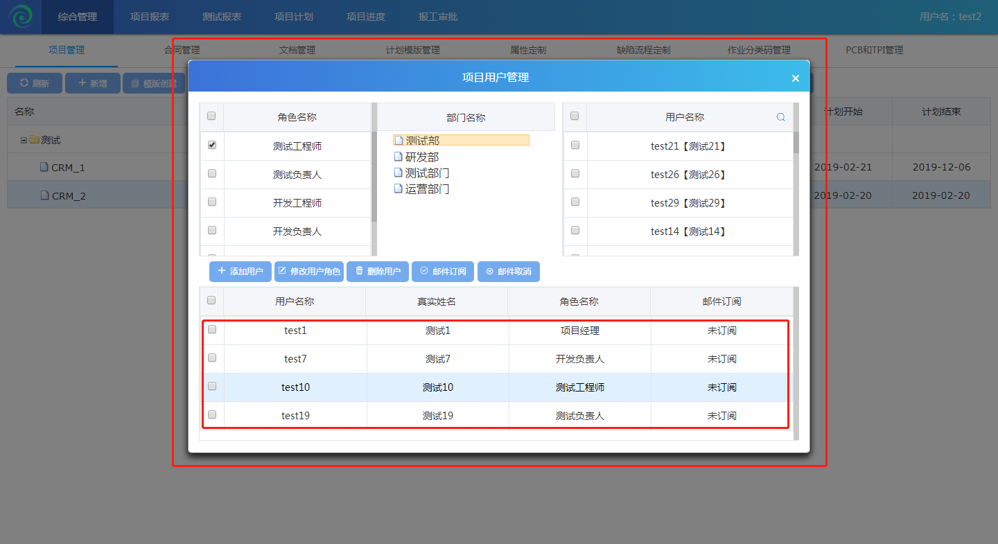 選擇新增的項目-CRM項目,點擊【項目團隊管理】按鈕,彈出項目用戶管理頁面。