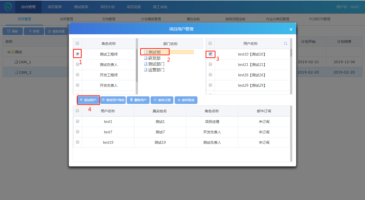 進行項目的團隊管理,項目經(jīng)理負責將項目其他成員加入項目,分配角色,這樣成員登錄系統(tǒng)才可看到相關(guān)項目信息,由項目經(jīng)理test1添加項目人員。