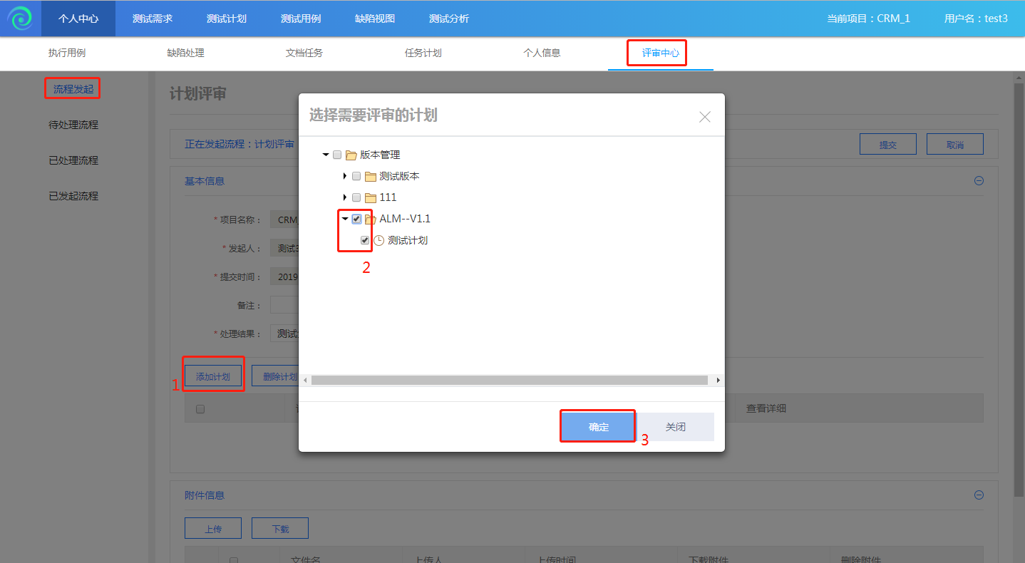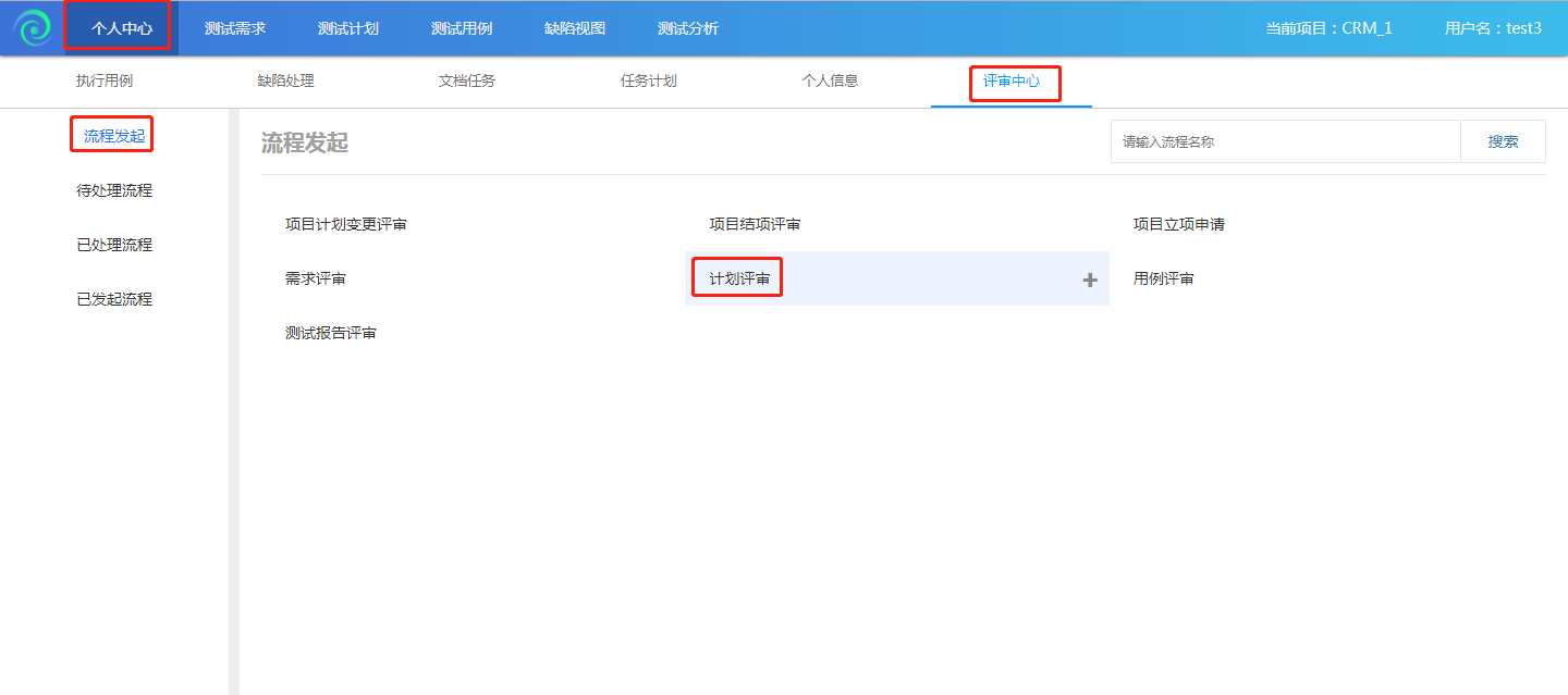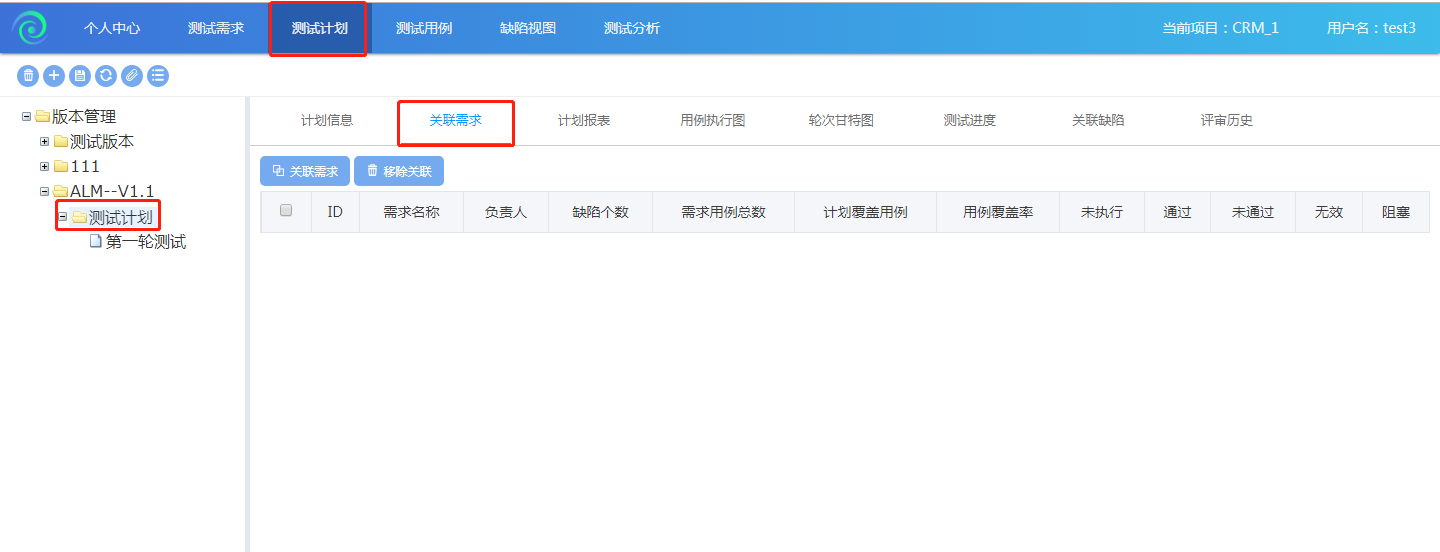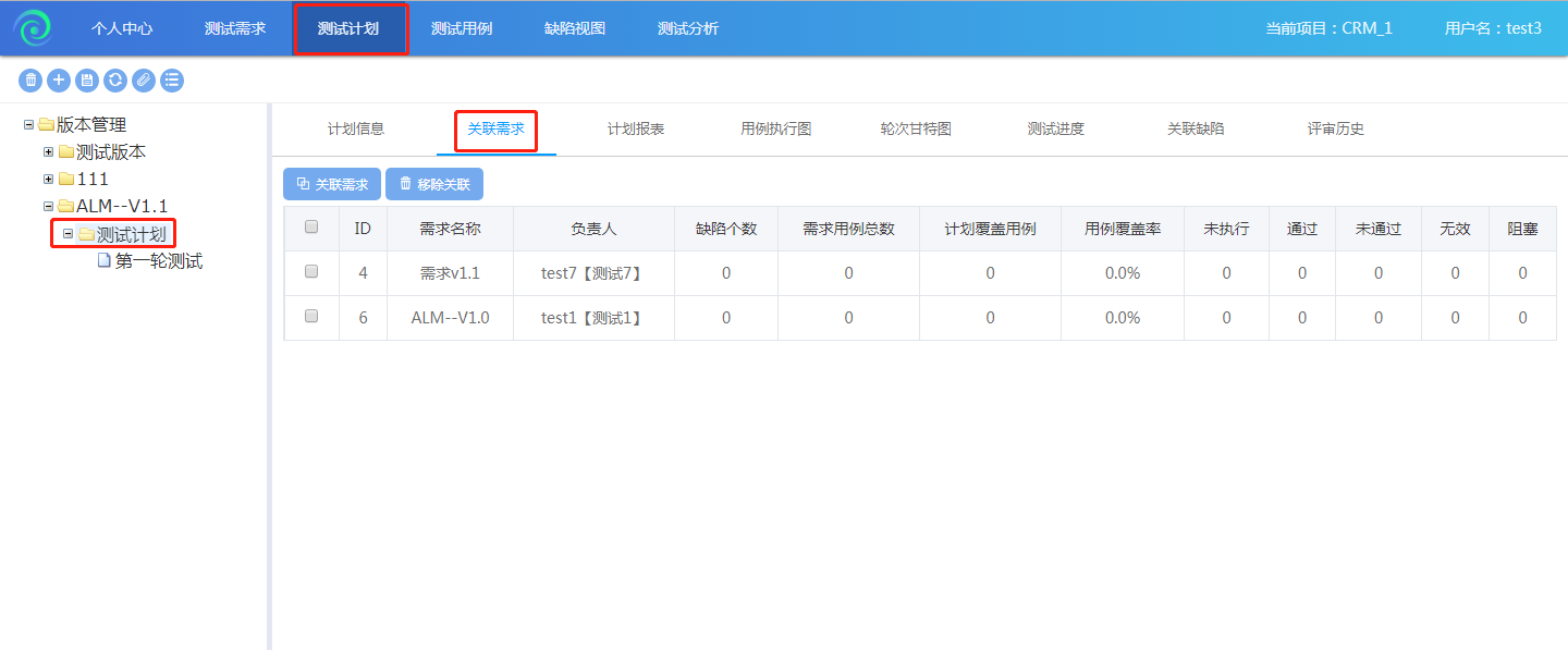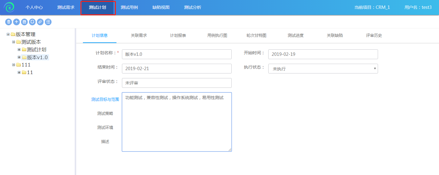 登錄測試負責人賬用戶名test3,密碼111111進入到CRM項目中,點擊【測試計劃】進入到測試計劃模塊中。