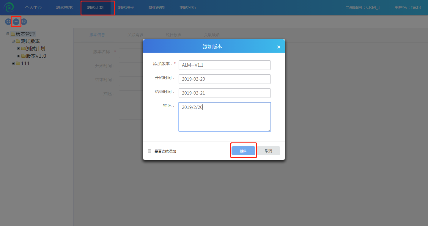 選中【版本管理】,點擊【新增測試版本】按鈕,彈出添加版本頁面,輸入版本名稱、選擇開始與結束時間,輸入描述,點擊【確定】按鈕,版本添加成功。