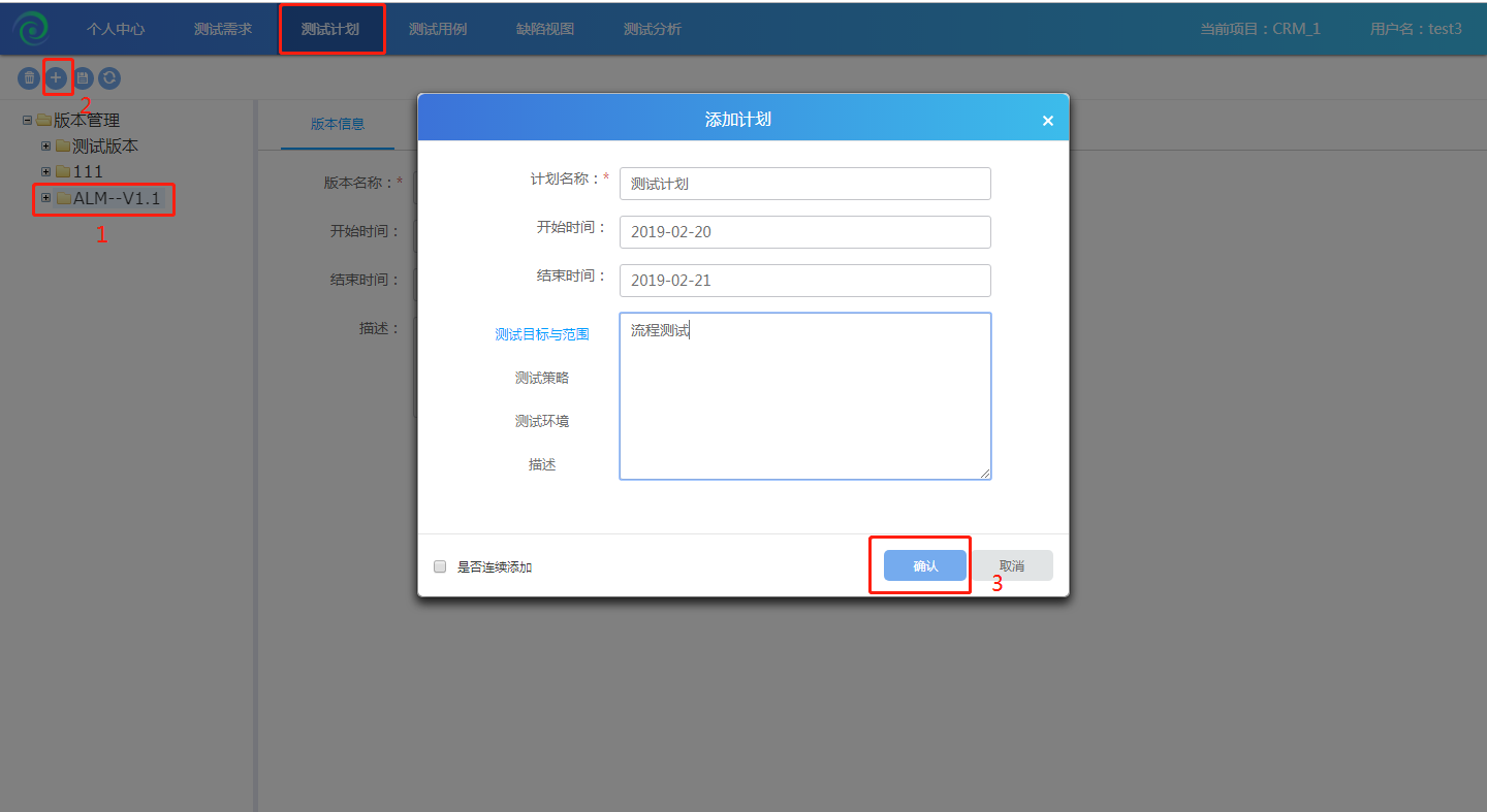 選中新創(chuàng)建的“ALM-V1.1”版本,點擊【新增測試計劃】按鈕,彈出添加計劃頁面,輸入計劃名稱,選擇計劃開始時間與結束時間,輸入測試目標與范圍、測試策略、測試環(huán)境與描述,點擊【確定】按鈕,計劃添加成功。