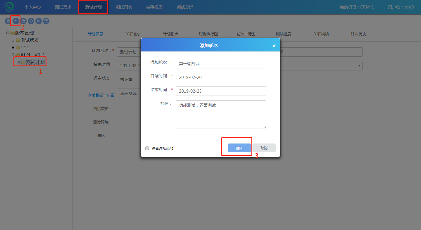 選中新增的“測試計劃1”,點擊【新增測試輪次】按鈕,彈出添加輪次頁面,輸入輪次名稱,選擇開始時間與結束時間,輸入描述,點擊【確定】按鈕,添加成功。