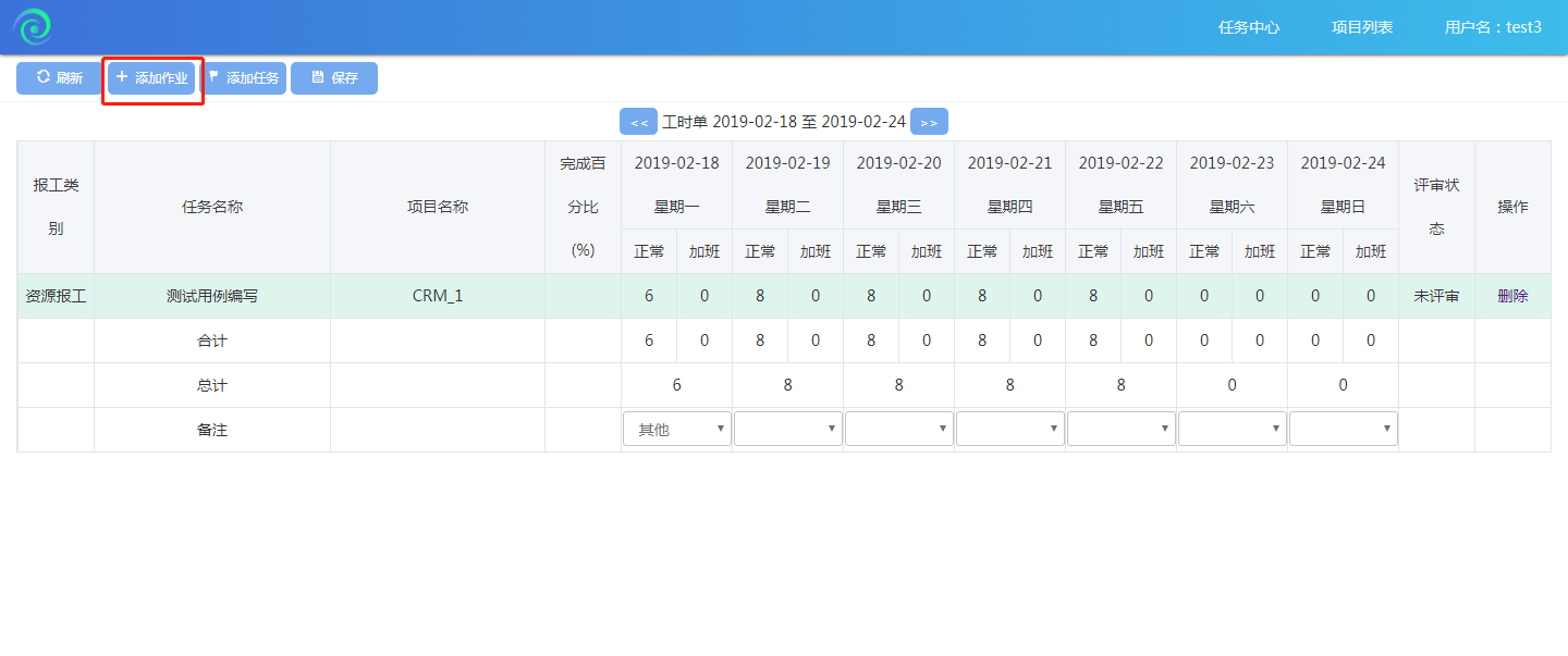 點擊2月18日(測試工程師test3在2月18日完成了測試用例編寫),如果工作日工作時長不夠8小時的,需要添加備注,點擊【保存】按鈕,提交報工成功。