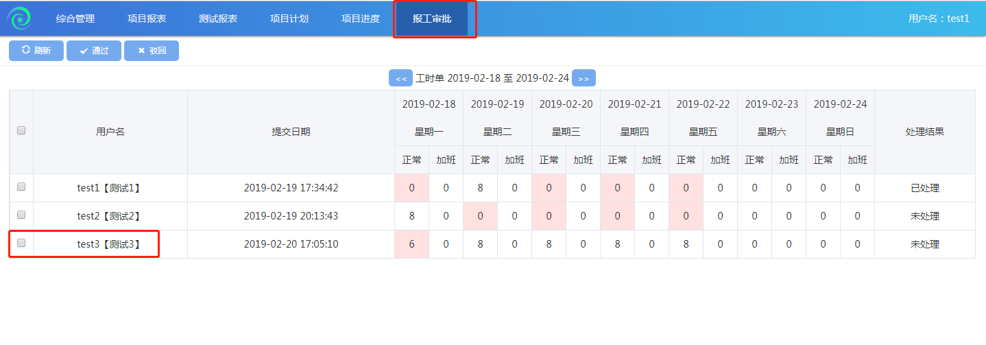 02-18至2019-02-24的報工時長,代表著待審批-測試用例編寫;勾選報工,點擊【通過】或者【駁回】按鈕,報工審批完成。