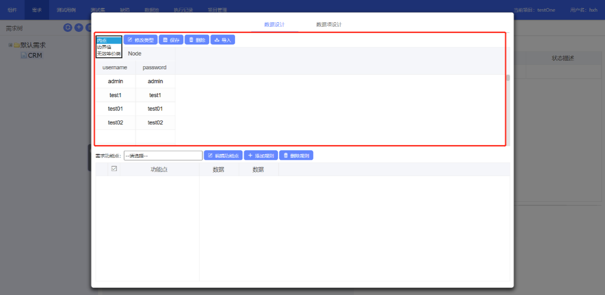 1. 點擊“用例設計”; 2. 表格中相應欄位下輸入?yún)?shù),參數(shù)可設置為“內點”“邊界值”“無效等價類”; 3.點擊保存完成參數(shù)化設置; 數(shù)據(jù)導入:通過excel配置模板后進行導入數(shù)據(jù);