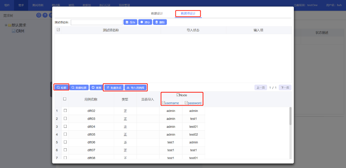 1. 勾選需要的數(shù)據(jù)欄位; 2. 點擊“檢索”,生成用例; 3. 勾選需要修改名稱的用例后,點擊“批量修改”進行用例名稱修改;(可省); 4. 勾選需要導入用例庫的用例后,點擊“導入用例庫”進行導入; |