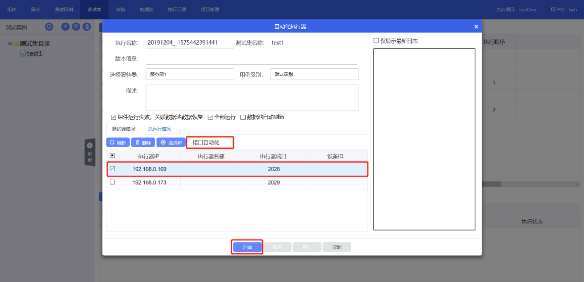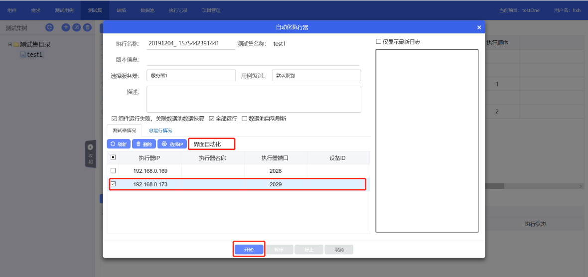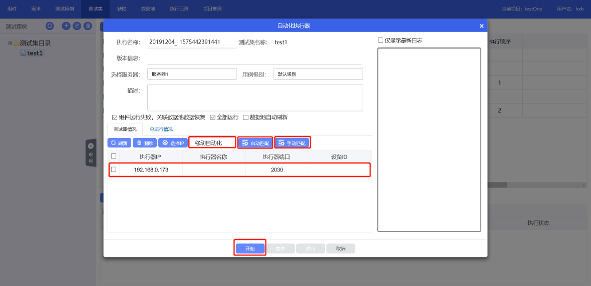1.選擇需要執(zhí)行的測試集,點(diǎn)擊自動執(zhí)行發(fā)起 2.選擇測試器情況,選擇界面自動化,接口自動化,移動自動化 3.執(zhí)行界面(或者接口)自動化時,直接勾選執(zhí)行器所在的IP 4.執(zhí)行移動自動化時,勾選執(zhí)行器所在IP后,點(diǎn)擊移動設(shè)備自動匹配(前臺:有移動設(shè)備連接)或點(diǎn)擊手動匹配,手動選擇連接設(shè)備,選擇設(shè)備ID 5.點(diǎn)擊開始按鈕,發(fā)起用例自動執(zhí)行 |