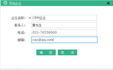 【添加】按鈕,彈出添加企業(yè)對(duì)話框,依次輸入企業(yè)名稱、聯(lián)系人、電話和郵箱,點(diǎn)擊【確定】按鈕,添加成功。