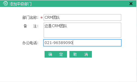 【添加子部門】按鈕,可以彈出部門對(duì)話框,輸入部門名稱、備注和辦公電話,點(diǎn)擊【確定】按鈕,添加成功。
