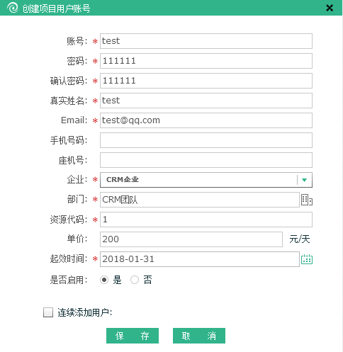 【添加用戶】按鈕,彈出創(chuàng)建項(xiàng)目用戶賬號(hào)對(duì)話框,輸入賬號(hào)、密碼、真實(shí)姓名、Email、資源代碼和單價(jià),選擇企業(yè)和部門,點(diǎn)擊【保存】按鈕,添加完成。