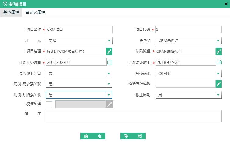 【新增項(xiàng)目】按鈕,彈出新增項(xiàng)目頁(yè)面,輸入項(xiàng)目名稱、項(xiàng)目代碼,選擇狀態(tài)-新建(根據(jù)項(xiàng)目目前所處狀態(tài)選擇項(xiàng)目狀態(tài),項(xiàng)目狀態(tài)包括:新建、立項(xiàng)、實(shí)施、完成、結(jié)項(xiàng)),選擇角色組-CRM角色組(后臺(tái)管理創(chuàng)建),選擇項(xiàng)目經(jīng)理、缺陷流程、計(jì)劃開始與結(jié)束時(shí)間、分類碼組,是否線上評(píng)審-是、強(qiáng)關(guān)聯(lián)-是,點(diǎn)擊【確定】按鈕,添加成功。