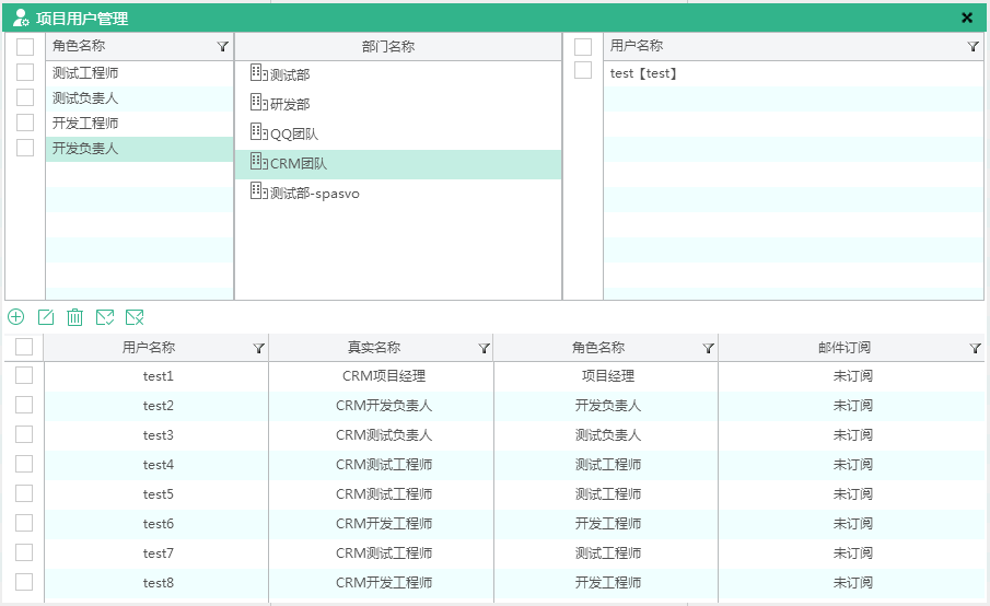 進(jìn)行項(xiàng)目的團(tuán)隊(duì)管理,項(xiàng)目經(jīng)理負(fù)責(zé)將項(xiàng)目其他成員加入項(xiàng)目,分配角色,這樣成員登錄系統(tǒng)才可看到相關(guān)項(xiàng)目信息,由項(xiàng)目經(jīng)理test1添加項(xiàng)目人員。