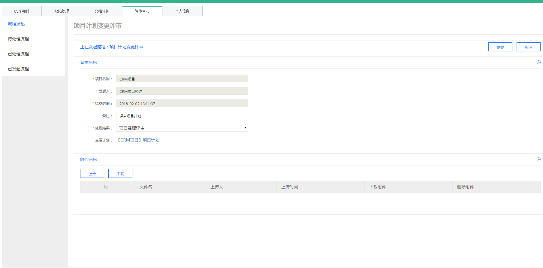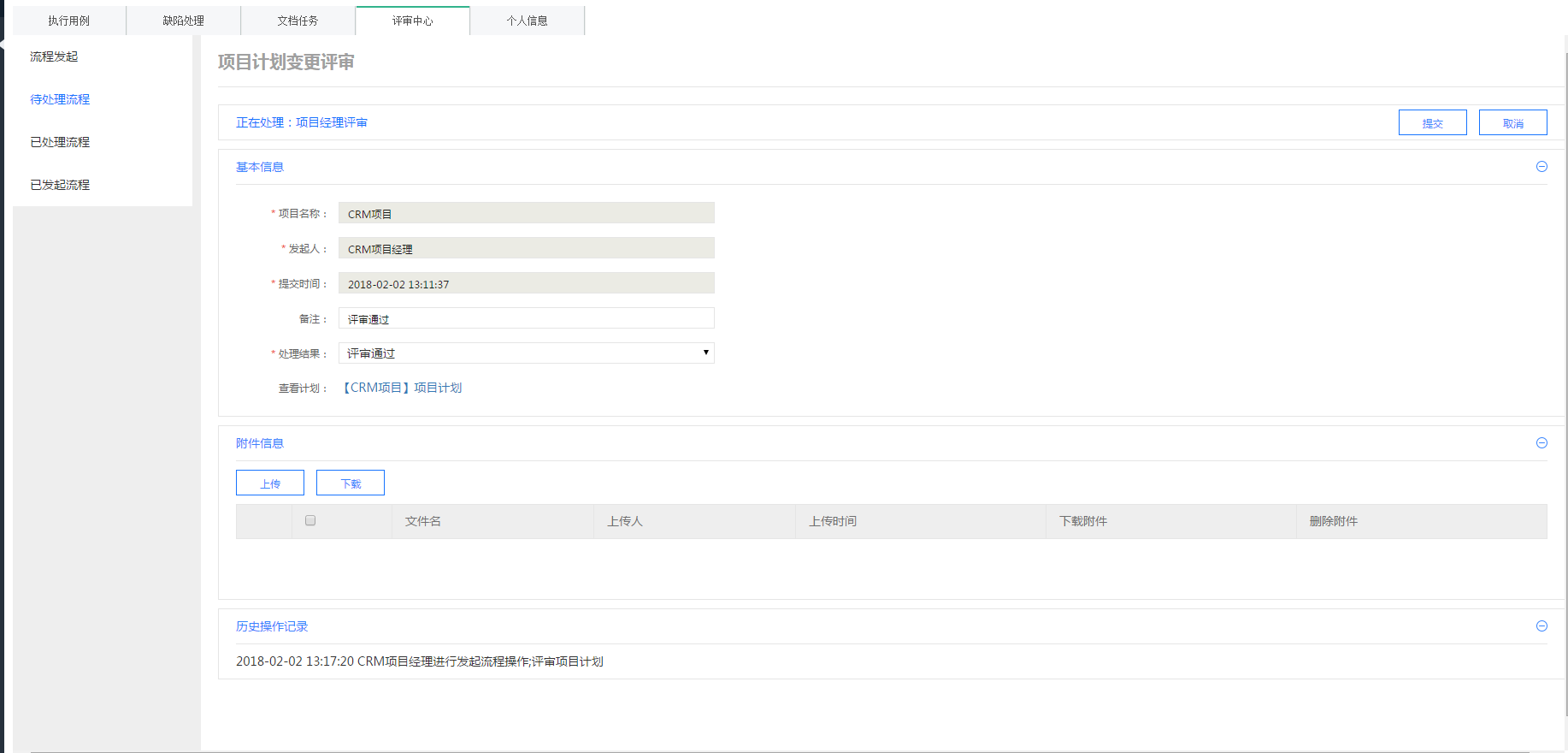 在該頁面可以查看CRM項(xiàng)目的項(xiàng)目計(jì)劃,點(diǎn)擊【提交】按鈕,發(fā)起評(píng)審成功,處理結(jié)果是-項(xiàng)目經(jīng)理評(píng)審。