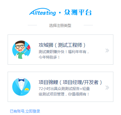 點(diǎn)擊選擇注冊(cè)攻城獅(測(cè)試工程師)或者項(xiàng)目錦鯉(項(xiàng)目經(jīng)理/開(kāi)發(fā)者),根據(jù)資料填寫注冊(cè),直到完成。