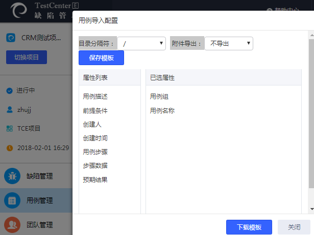 1.配置用例導入導出模板,選擇需要的屬性列表; 2.下載模板,填寫各個屬性的屬性值; 3.點擊“更多操作—用例導入”,導入模板,可以實現(xiàn)用例導入; 4.點擊“更多操作—用例導出”,可以導出現(xiàn)有的用例; |