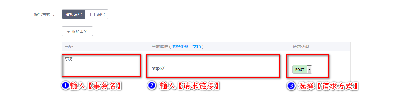 Step1:在新增腳本頁(yè)面的單擊【添加事務(wù)】按鈕,輸入事務(wù)名稱(chēng)。事務(wù)名可根據(jù)實(shí)際業(yè)務(wù)制定,然后添加待測(cè)系統(tǒng)鏈接。