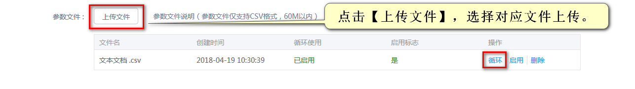 在新增腳本頁面上傳文件。上傳后的文件默認開啟循環(huán)使用狀態(tài),即參數(shù)文件中的數(shù)據(jù)會循環(huán)掃描使用。