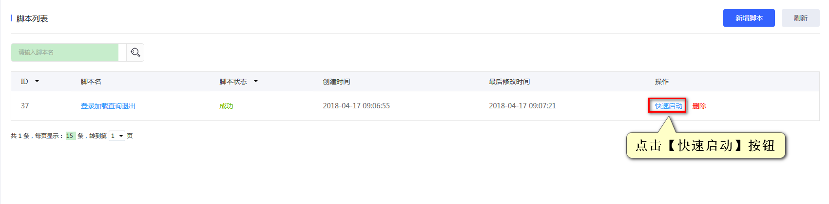 腳本編寫(xiě)完成后,在腳本列表頁(yè)單擊腳本右側(cè)的快速啟動(dòng)按鈕即可運(yùn)行腳本。系統(tǒng)會(huì)自動(dòng)創(chuàng)建腳本對(duì)應(yīng)的場(chǎng)景與任務(wù)。執(zhí)行時(shí)長(zhǎng)默認(rèn)3分鐘,并發(fā)用戶數(shù)上限 2000。