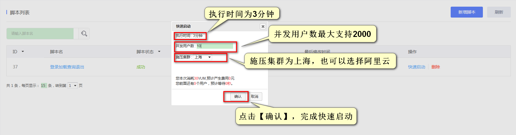 在快速啟動(dòng)對(duì)話框,輸入并發(fā)用戶數(shù),并選擇施壓集群。