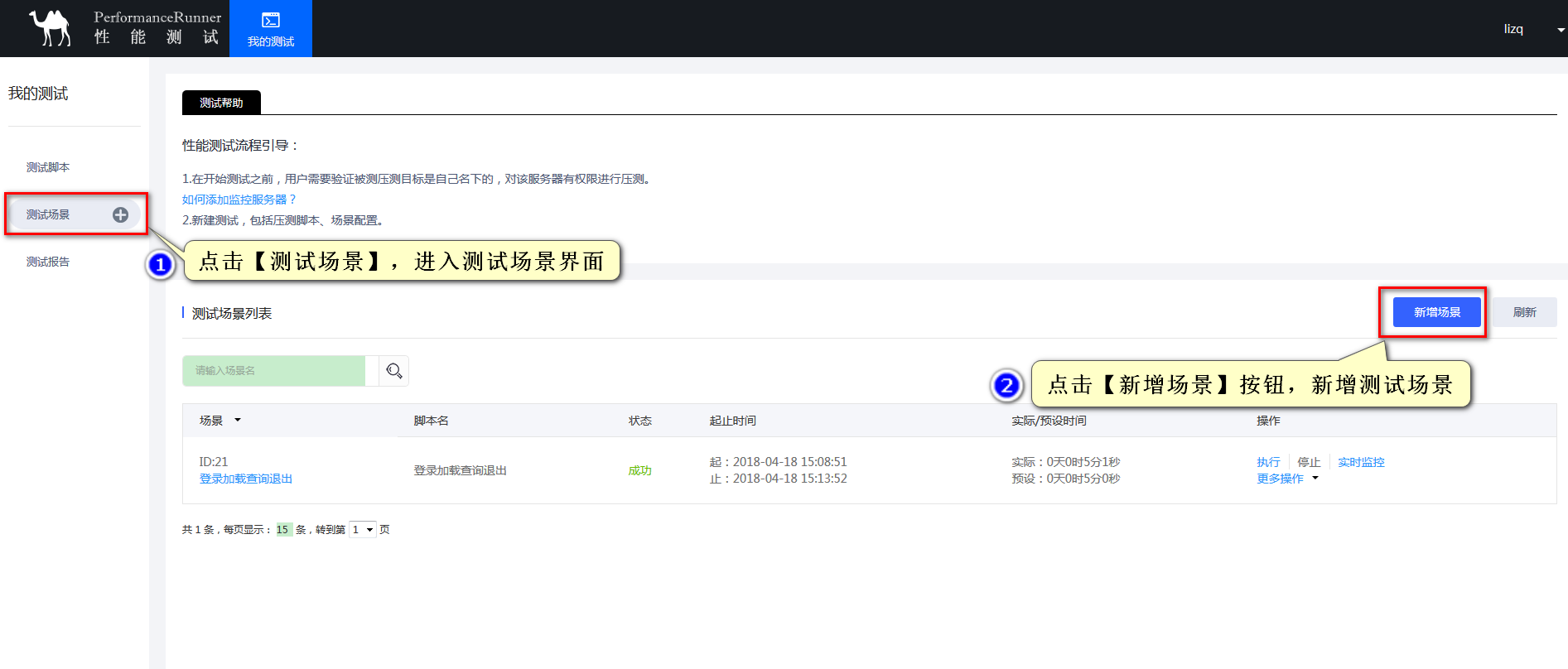 1) 在控制臺左側(cè)導航欄選擇測試場景,單擊頁面右上角的【新增場景】按鈕,進入場景創(chuàng)建/編輯頁面。