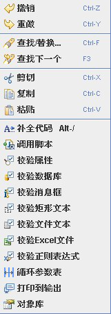如上所示,所有對腳本的編輯操作都可以在編輯菜單下完成,包括對腳本的撤銷,重做,查找,替換,剪切,復(fù)制,粘貼,循環(huán)參數(shù)表,對象庫,以及對各種需求的校驗(yàn)。