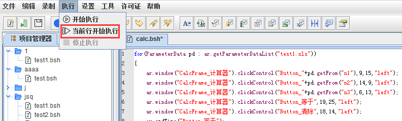 可以通過執(zhí)行菜單的當(dāng)前行開始執(zhí)行功能,實(shí)現(xiàn)從腳本編輯器光標(biāo)所在行開始進(jìn)行回放操作。如下: