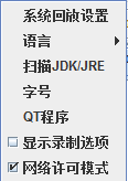 如上圖所示,設(shè)置菜單中包含了系統(tǒng)、語言設(shè)置、掃描JDK/JRE、字號、QT程序、顯示錄制選項(xiàng)及網(wǎng)絡(luò)許可模式等的設(shè)置,軟件現(xiàn)在支持簡體中文和英文和臺灣繁文設(shè)置,在程序初次啟動時,會根據(jù)系統(tǒng)默認(rèn)語言選擇初始語言類型和字號,當(dāng)用戶手動選擇語言類別和字號時,軟件再次啟動才會生效。本軟件自帶JRE1.6,如果用戶電腦上在安裝了AutoRunner后又安裝了其他的JDK版本,則可以點(diǎn)擊此按鈕,將AutoRunner所需要的相應(yīng)文件寫入JDK中,省去了用戶重裝AutoRunner的麻煩。