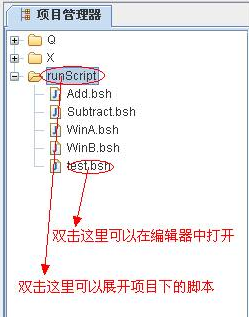 項目管理器用來顯示當(dāng)前 IDE 中所有的項目,并且顯示項目中的腳本。項目管理器中的項目及腳本組織成一個樹狀結(jié)構(gòu),每一個項目名稱是一個文件夾,其下的腳本都位于此文件夾下。對于每一個節(jié)點,如果是項目名稱,雙擊可以打開;如果是腳本,則雙擊可以把這個腳本在編輯器中打開。樹支持鼠標(biāo)右鍵菜單,支持刪除、增加等操作。