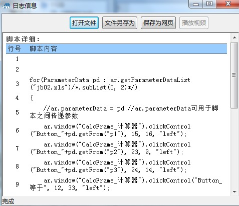 腳本詳細,記錄詳細及腳本終的執(zhí)行結果。整個腳本的執(zhí)行結果:包括以下項:腳本名,運行開始時間,運行結束時間,運行結果點擊記錄詳細的某一行腳本可同步指定到腳本詳細的具體行。此時,可將當前的日志信息,另存為一個*.logd文件、保存為一個*.html網(wǎng)頁。