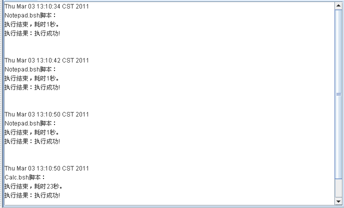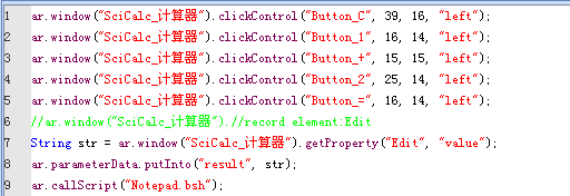 下面是一段計算器的腳本。前面五句做了一個加法操作,第七句是得到計算器的計算結果,第八句是用putInto命令將結果保存到名為result的變量用,變量名可以任取,其中parameterData是一個ParameterData類型的全局變量。第九句是調用Notepad.bsh記事本腳本。