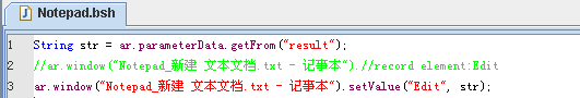 記事本的腳本比較簡單,第一句是從parameterData中把result的結果取出,這里調用的是getFrom命令。第三句是將結果輸出到記事本中。